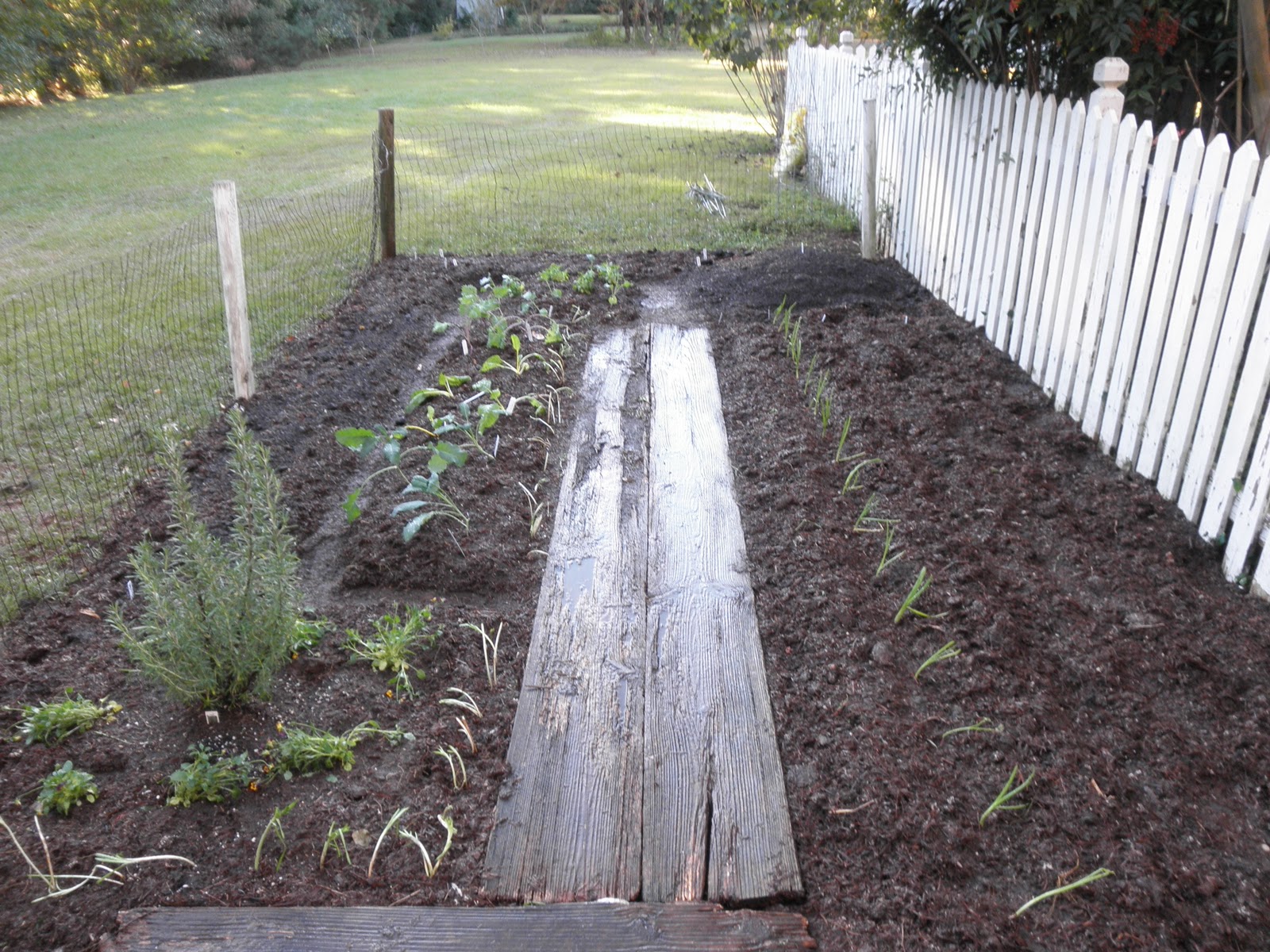 In the picture above, you can see the Rosemary in the bottom left-hand corner surrounded by johnny jump-ups (which you can eat). Back behind the rosemary, there's a bed of kale and chard and broccoli. To the left, there's a bed with kale seeds waiting to germinate. Along the far fence there are two short rows of spinach seeds. In the top right-hand corner, we planted an spiral of chard seeds. (I'm so excited about this!) All along the right-hand side of the garden there are root crops planted: turnips, beets, vidalia onions (which you can see), and a row of bunching onions (seeds). Out of sight, behind the camera are a bunch of herbs (parsley, sage, oregano, dill, fennel, and sorrel), mesclun mixes (that's a fancy word for baby-greens like you can buy in a bag at Publix from EarthFare Organics or somebody similar), in addition to more root crops. The whole garden is 10x36, just in case you're wondering.