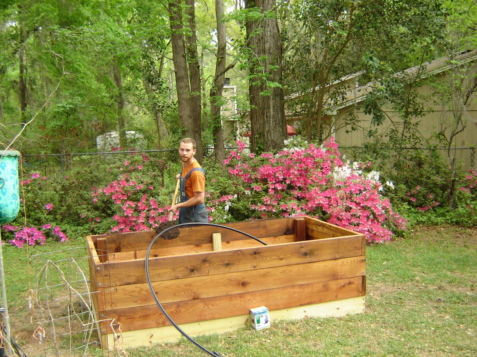 Last week, I put together this raised bed for Andreas, Sandra and Ted. It's made of cedar construction treated with linseed-oil. Take a look. Also note the micro-irrigation tubing sticking out in preparation for filling with soil and compost