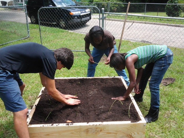Youth began work on the farm in July. The picture below shows Tierra, Khadijah, and Martin smoothing out the compost-mix in a 4'x4' raised bed, which they planted with sweet potatoes.