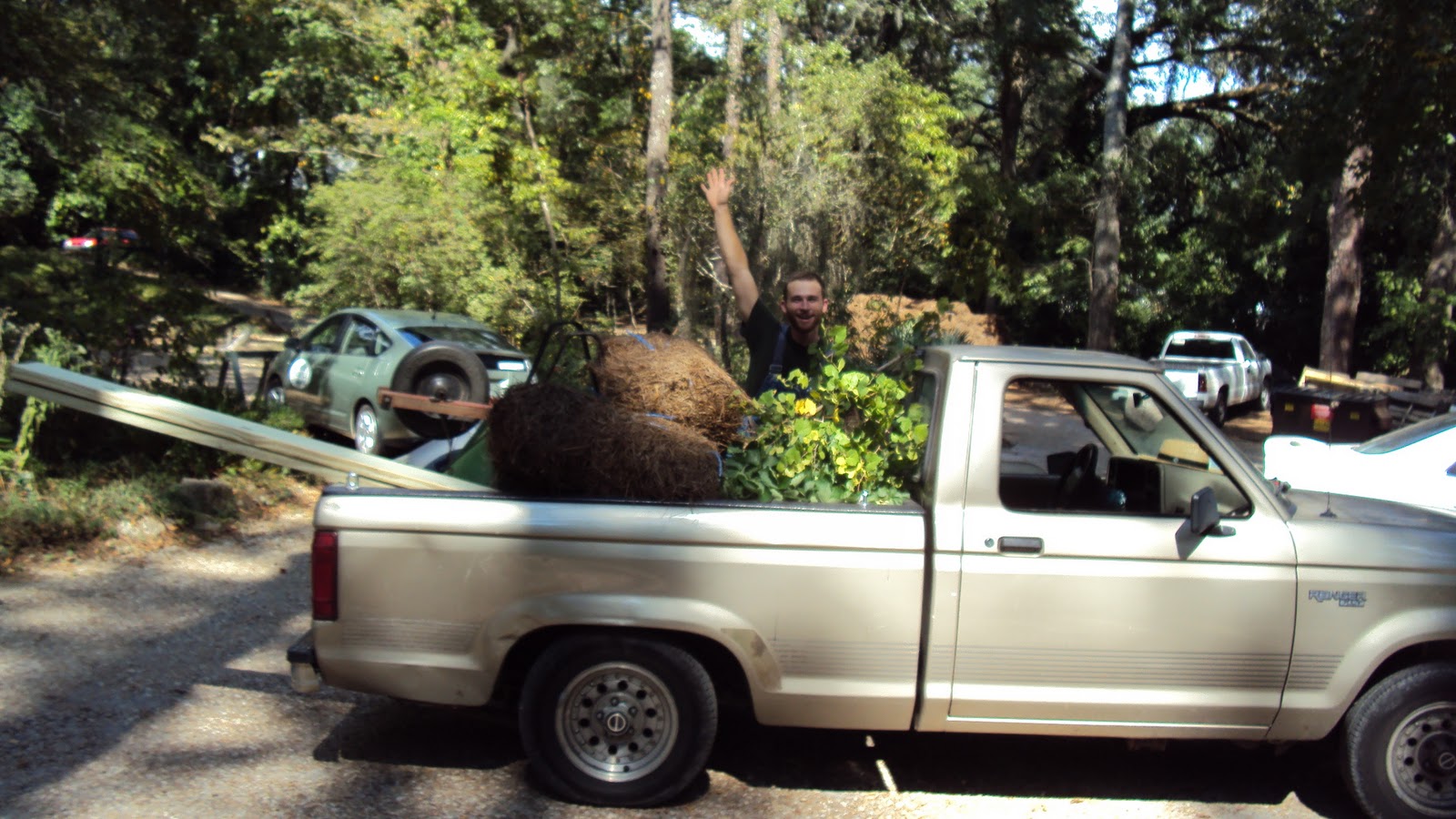 After loading with lumber, compost, strawberry plants (for a 4x10 strawberry garden)-- in addition to shovels, rakes, power-tool bag, wheelbarrow, and supplies for a micro-irrigation system at Christ Presbyterian Church, I stopped in at Native Nurseries to purchase some pine straw. Upon loading it on top, I was beside myself wanting to take a picture. (Just look at it: notice how the truck sags under the weight. Even the tires are struggling. Made me laugh. And scared me for fear of breaking my truck.) Having no camera, I ran back inside and Jodi happily obliged my whim for a picture.