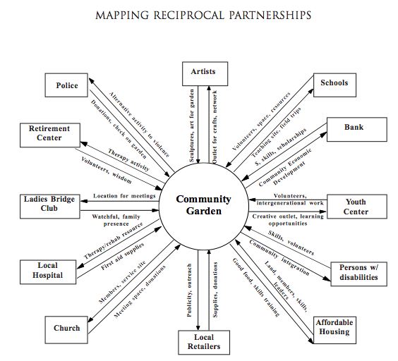 The flip side of the ABCD coin is that everyone has a dream. Unless there is an exchange, a sense that people are in someway getting something they want (out of participating), any sharing of their assets and participation or support of a school garden is going to be short lived. If you're going to effectively rally & sustain a school garden team, you need to think like the below community garden partner map developed by the American Community Gardening Association. What does the school garden get? And what does the school garden team member get? It's got to go both ways.