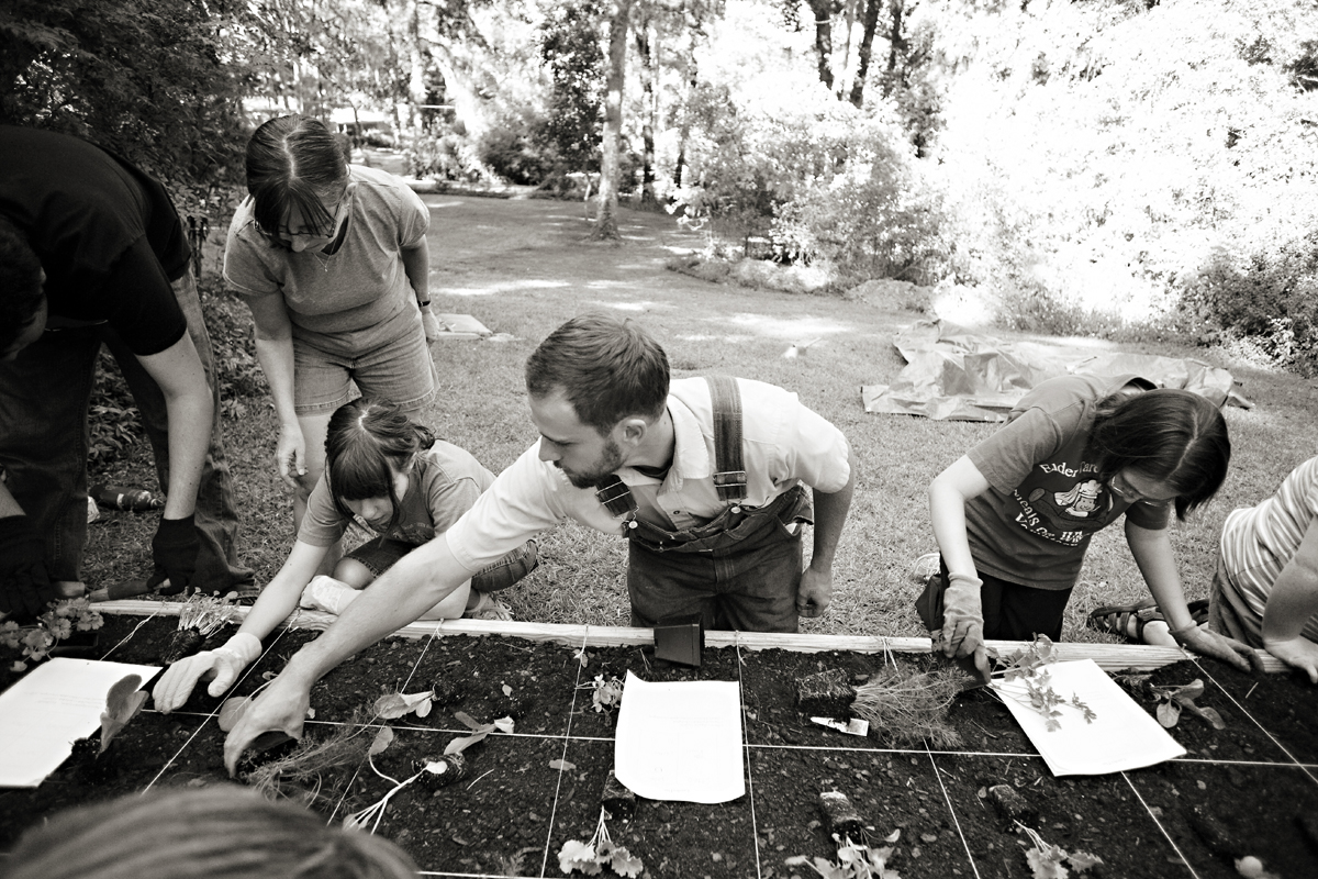 In mid October, the teens and I (with ample support from parents and a few of my friends) launched the food garden workshop series by filling a raised bed frame with compost, tacking in nails and running string to make the Square Foot Gardening grid.  After that, each of us planned and planted a 2x2ft (or 4 square feet) space with two kinds of cooking greens (collards, chard, mustards and/or kale), one cool season herb (fennel, dill, cilantro or parsley), and a square foot of lettue (romaine).